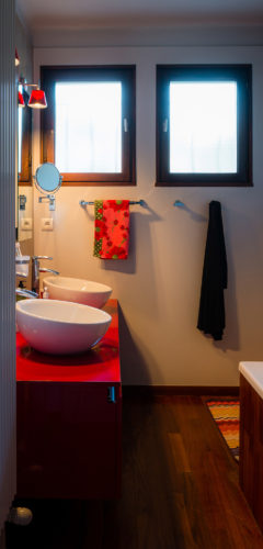 C’est une salle de bains ou on a envie de se détendre, de passer du temps. On y trouve un côté chaleureux apporté par le choix du sol et le rouge des meubles. L’espace est optimisé et les rangements sont bien pensés.
