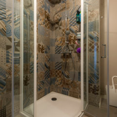 Mettre des façades miroir pour donner une impression d’espace dans la salle de bains. Le choix du mobilier dans la salle d’eau avec un forme arrondie et peu profonde pour ne pas alourdir.