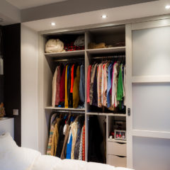 C’est le placard sur-mesure par excellence. L’espace de rangement est optimisé ; la répartition des étagères, penderies et tiroirs est adaptée aux besoins des clients.